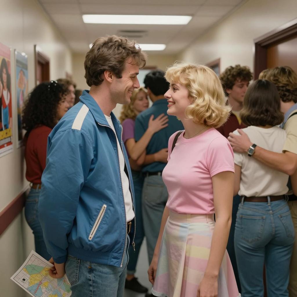 Group of people in a hallway, 1980s style. Man in blue jacket with white stripes, short brown hair, smiling, facing woman with short blonde hair, pink crop top, pastel skirt. Woman smiling, leaning slightly towards man. Background: people hugging, posters on beige wall, fluorescent lighting. Man holding map on left. 9 people total. Casual clothing, intimate interactions.