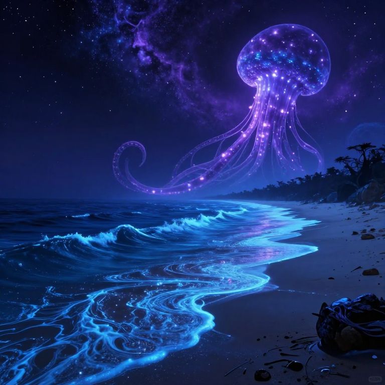 Digital artwork of a bioluminescent jellyfish hovering over a dark, starry night sky. The jellyfish, glowing in vibrant purple and blue hues, has a translucent, spherical bell and long, flowing tentacles. Below, the ocean's waves reflect the jellyfish's light, creating a luminous blue path along the shore. The beach is dotted with dark, shadowy rocks and sparse vegetation. The Milky Way is faintly visible in the background, adding a cosmic feel to the scene. The overall atmosphere is mystical and otherworldly, blending elements of fantasy and science fiction.