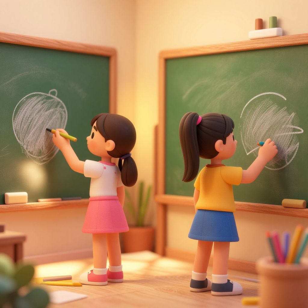 AI tween girls drawing in a cozy studio with bright chalkboards and rainbow-colored tools, warm ambient lighting, soft focus background, whimsical and creative vibe, 3D render style, ideal for children's art inspiration.