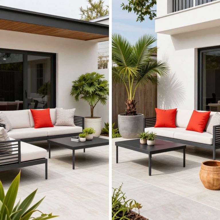 Transformed patio showcasing a modern outdoor living space with sleek furniture, vibrant cushions, and stylish potted plants, highlighting a before-and-after comparison by Fore Cherpece Simes.
