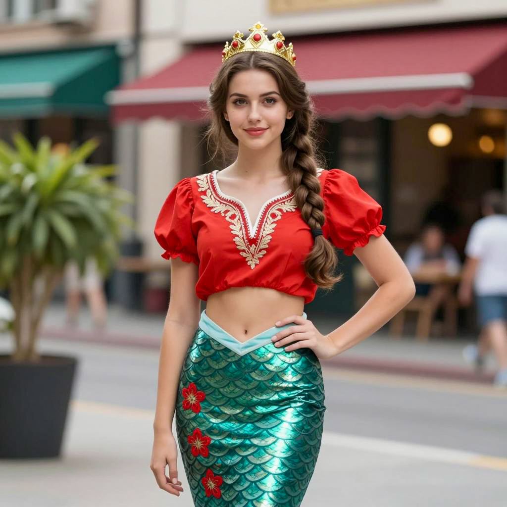 Teacher mermaid costume, photorealistic portrait, young woman, long brown braided hair, wearing a gold crown, red embroidered red shirt with white collar, teal mermaid-style skirt with red floral patterns, standing outdoors, city street background, blurred red awning, green plant, daytime, confident expression, detailed ures, vibrant colors, realistic lighting, T2I, fantasy cosplay style, front view