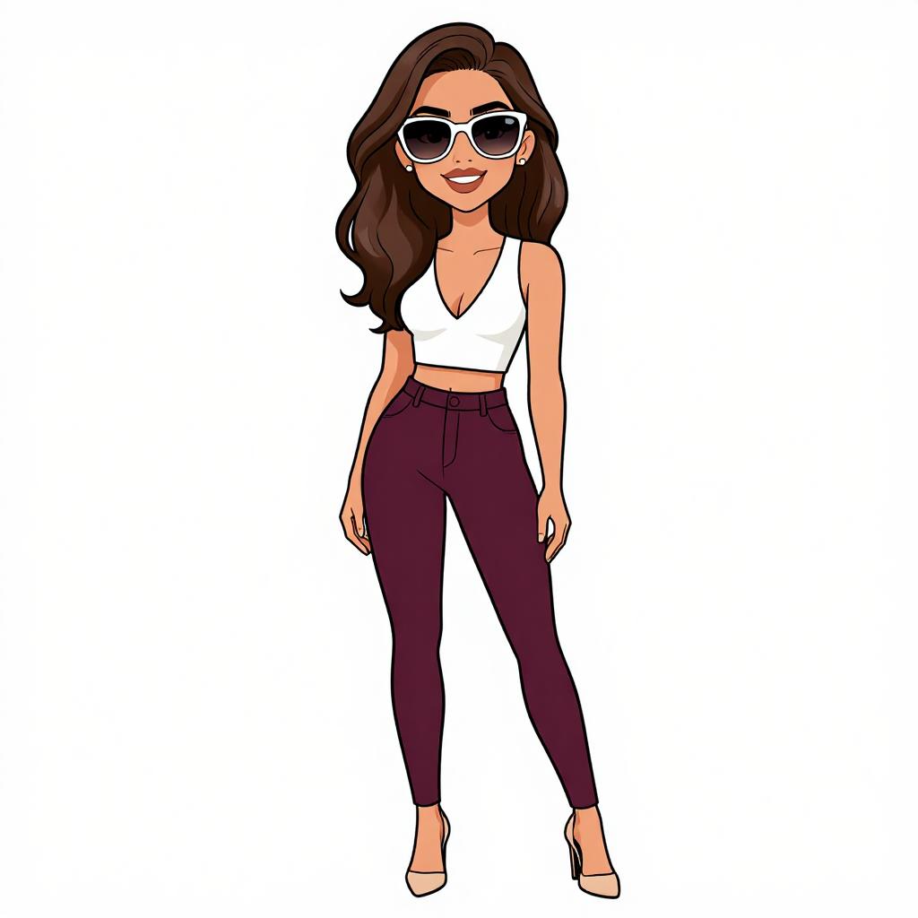Illustration of a fashionable woman with long brown hair wearing a sleeveless maroon ribbed crop top with a high neckline, paired with black high-waisted shiny leather-like leggings. She accessorizes with large hoop earrings, black sunglasses, and strappy black high heels. The woman is smiling, showcasing a confident and stylish look.