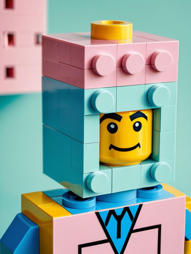 Close-up portrait of a Lego minifigure styled as a man wearing a costume made of pastel-colored Lego building blocks. The figure has a yellow face with sharp features, intense eyes, and a serious expression. The costume includes blocks in soft purple, blue, green, and yellow with detailed clothing patterns printed on the torso, resembling a collared shirt and tie.