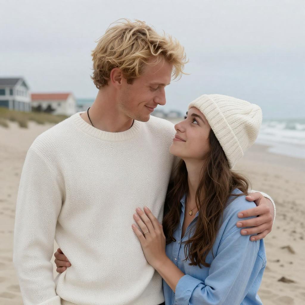 Photograph of a young couple in a close embrace, smiling at each other. The man has curly brown hair, wearing a pink shirt, and the woman has short blonde hair, wearing a blue tank top. Background includes a blurry person and palm tree, with a sunset sky.