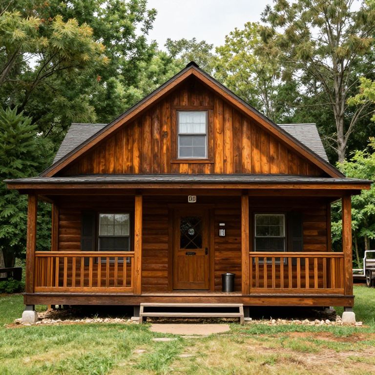 Photograph of a small wooden cabin with a gabled roof, centered in a grassy yard. The cabin's exterior is rich, reddish-brown wood with vertical logs and a dark gray shingled roof. A small, rectangular window is above the front door, which is flanked by two smaller windows. A simple wooden porch with a balustrade wraps around the front. The background features lush, green trees, indicating a forested area. The cabin sits on a concrete slab, with a single step leading to the porch. The overall style is rustic and cozy.