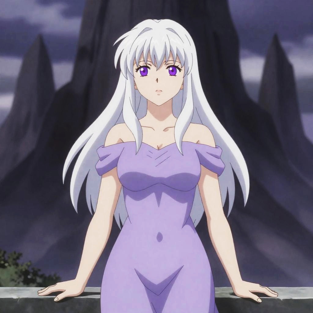 Anime-style drawing of a woman with long black hair, large breasts, wearing a purple bikini top, gold earrings, and a gold necklace. She has her eyes closed, red lips, and her arms raised, hands behind her head. Blue sky background with white clouds.