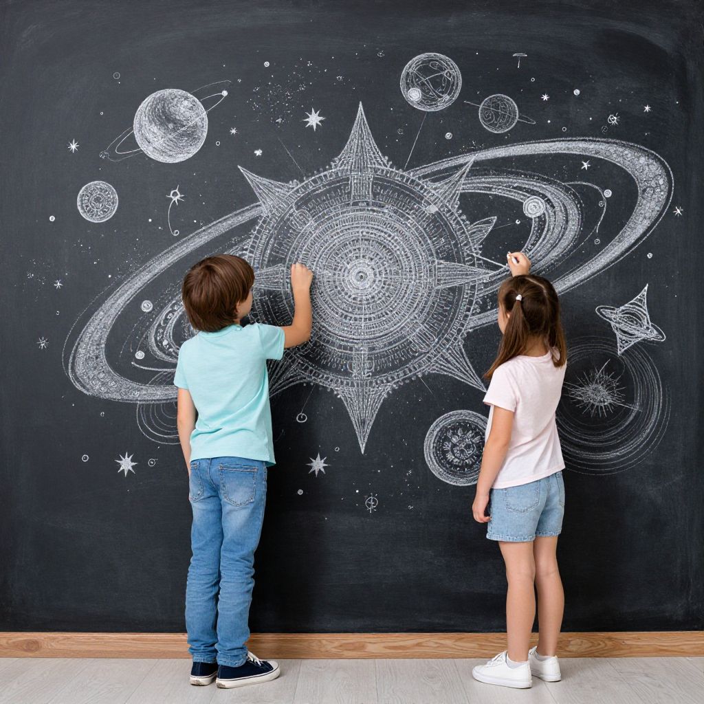 Two children stand before a large blackboard, one drawing intricate cosmic patterns with chalk while the other observes, surrounded by swirling galaxies and celestial bodies rendered in white against the dark surface.