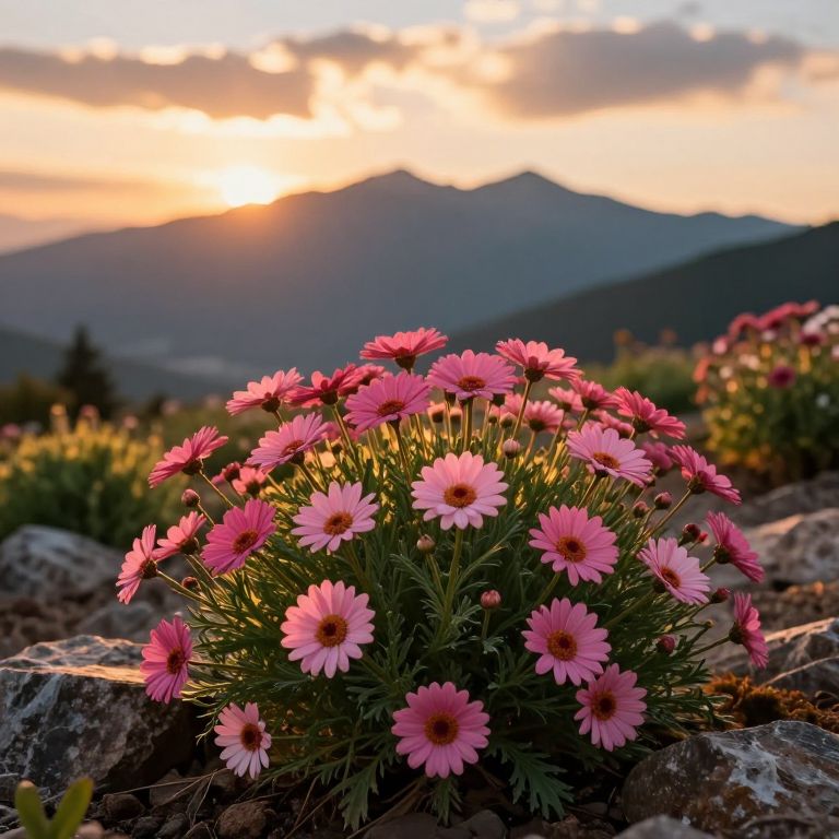 Sunset bathes vibrant pink daisies in golden light, as they stand resiliently among rocky soil and green foliage, with majestic mountains silhouetted against a warm, cloud-dappled sky.