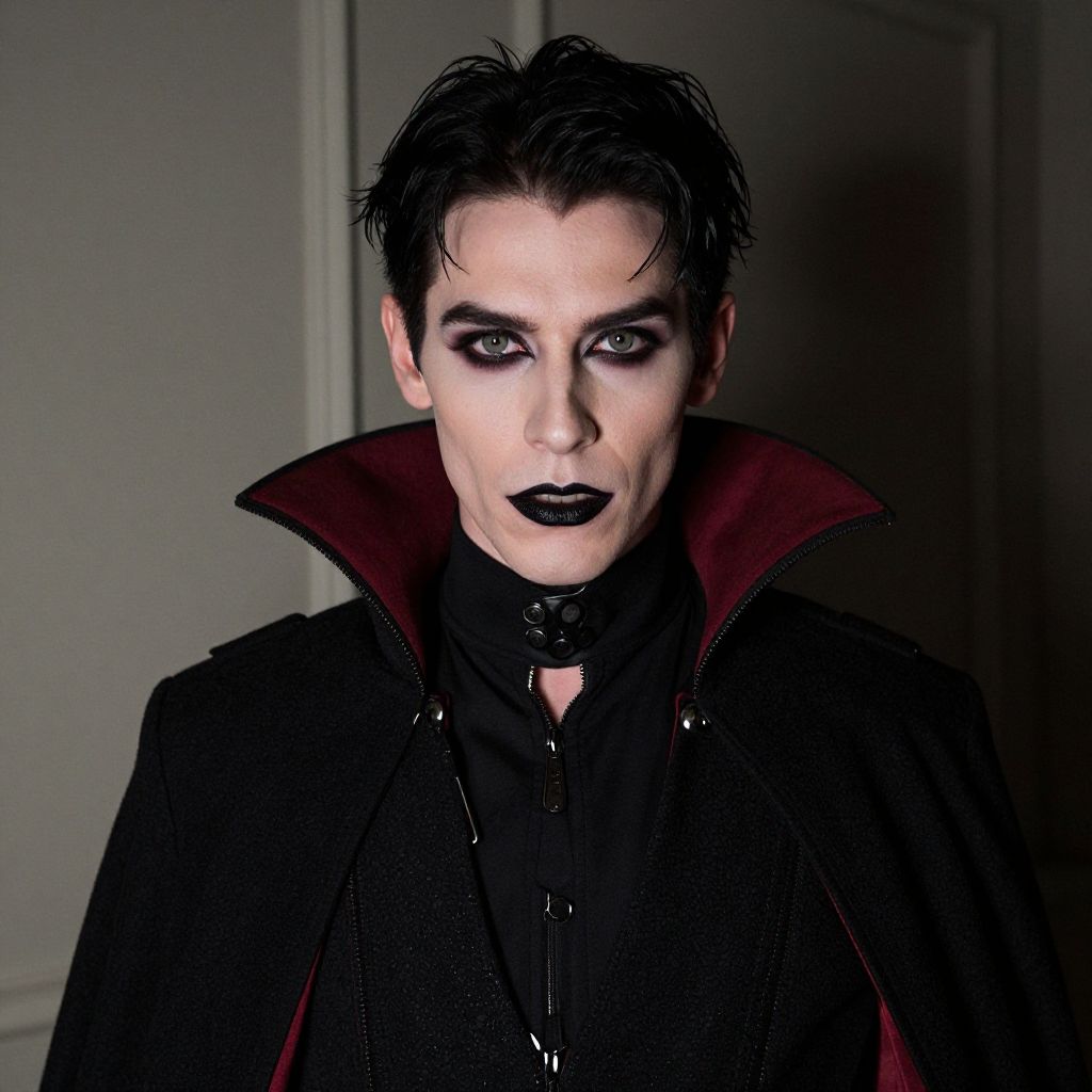 Photograph of a pale-skinned man with dark, slicked-back hair and intense black eye makeup, including a dramatic black line running from his left eyebrow down to his chin. He has deep red lipstick and a black goatee. His outfit includes a black jacket with a wide, red-lined collar, a black shirt, and a black tie. The background is a plain, gradient gray, emphasizing his striking appearance. The image has a digital, slightly stylized effect, enhancing his vampire-like look.