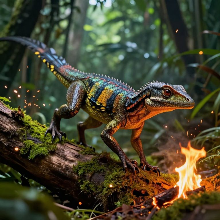 Photograph-like digital illustration of a colorful lizard with iridescent scales, standing on a moss-covered log in a dense forest. The lizard has a vibrant pattern of blues, yellows, and blacks, with a prominent ridge of spines along its back. Sparks fly from a small, bright orange fire beside the log. The background is a lush, green forest with blurred trees and foliage, creating a sense of depth. The lizard's sharp claws and focused gaze add a sense of alertness to the scene. The lighting highlights the lizard's scales and the fire's flames.