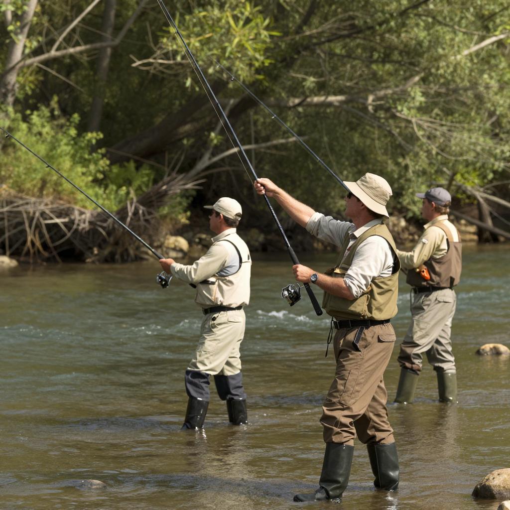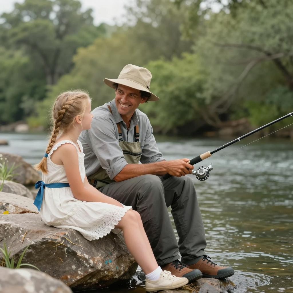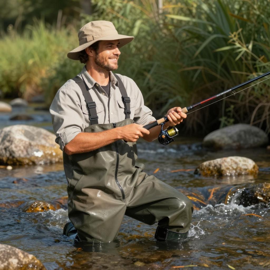 Man wading in a stream, fishing. Wearing beige hat, rolled-up sleeves, suspenders, and waders. Holding fishing rod with extended line, reel in left hand. Smiling. Rocks and greenery in background. Water flowing around legs. Sunlight illuminating scene.
