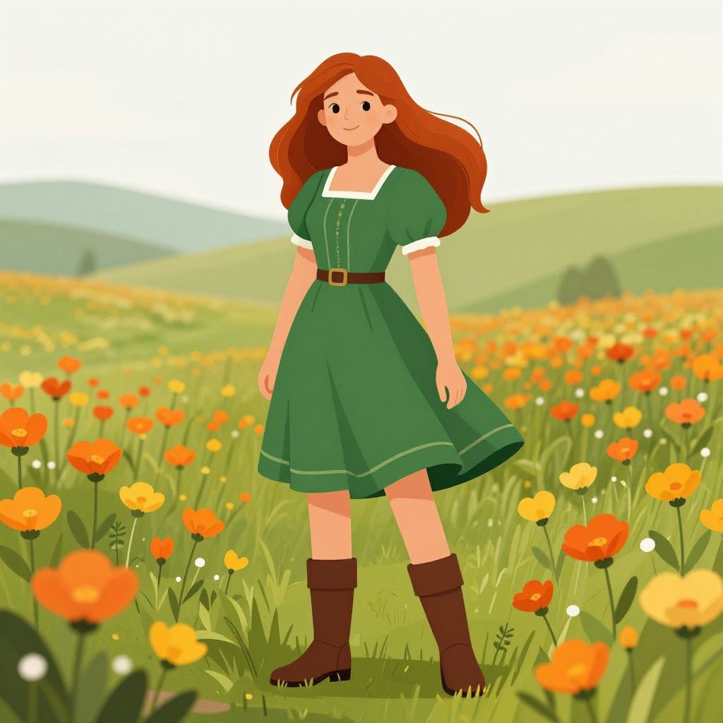 Irish woman character clip art L371 Carly stands gracefully amidst vibrant orange and yellow wildflowers, her flowing red hair cascading over a charming green dress paired with knee-high brown boots, exuding a whimsical and adventurous spirit.