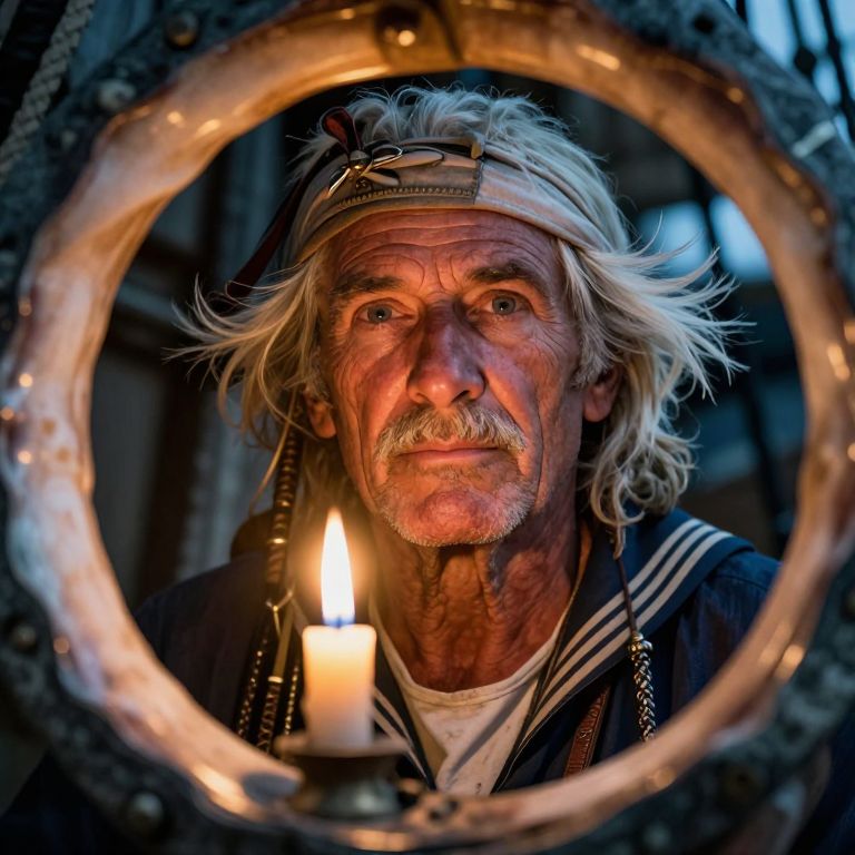 Envision a captivating portrait of a seasoned sea captain, his rugged features illuminated by the soft candlelight, exuding warmth and wisdom. The subtle shadows on his face betray a lifetime of adventures etched in every crease and line. Captured from an intriguing low-angle perspective, akin to peering through a seashell's eye, this mirrorless camera photo transports viewers into the heart of the captain's world. His intense gaze, framed by white, windswept hair, whispers tales of distant lands and untold adventures, while his worn sailor attire hints at countless stormy nights navigated with skill. This evocative image seamlessly blends timeless maritime narratives with a sense of wonder and mystery, inviting viewers on an emotional journey alongside the captivating captain.