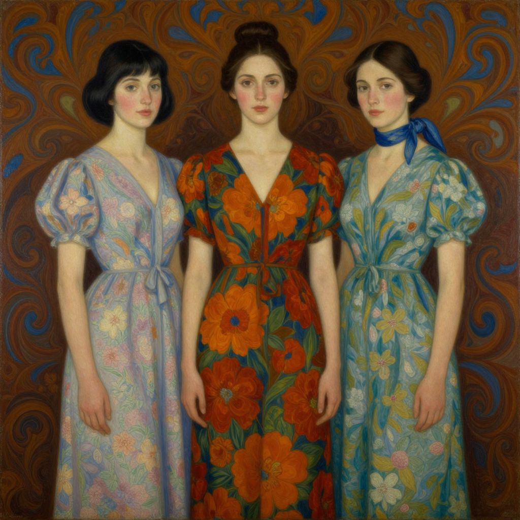 The painting features three women standing side by side, each adorned with intricate floral patterns on their dresses. The woman in the center wears a dress with large, bold flowers in shades of orange and red, while the women flanking her have dresses with smaller, more delicate floral designs in soft blues and greens. Their hair is styled in elegant updos, with the woman on the left sporting a dark bob and the woman on the right having her hair wrapped in a blue scarf. The background is a rich tapestry of swirling patterns in warm browns and cool blues, creating a harmonious contrast with the women's vibrant attire. The overall composition is balanced, with the women positioned centrally and the floral patterns creating a sense of depth and movement across the canvas.