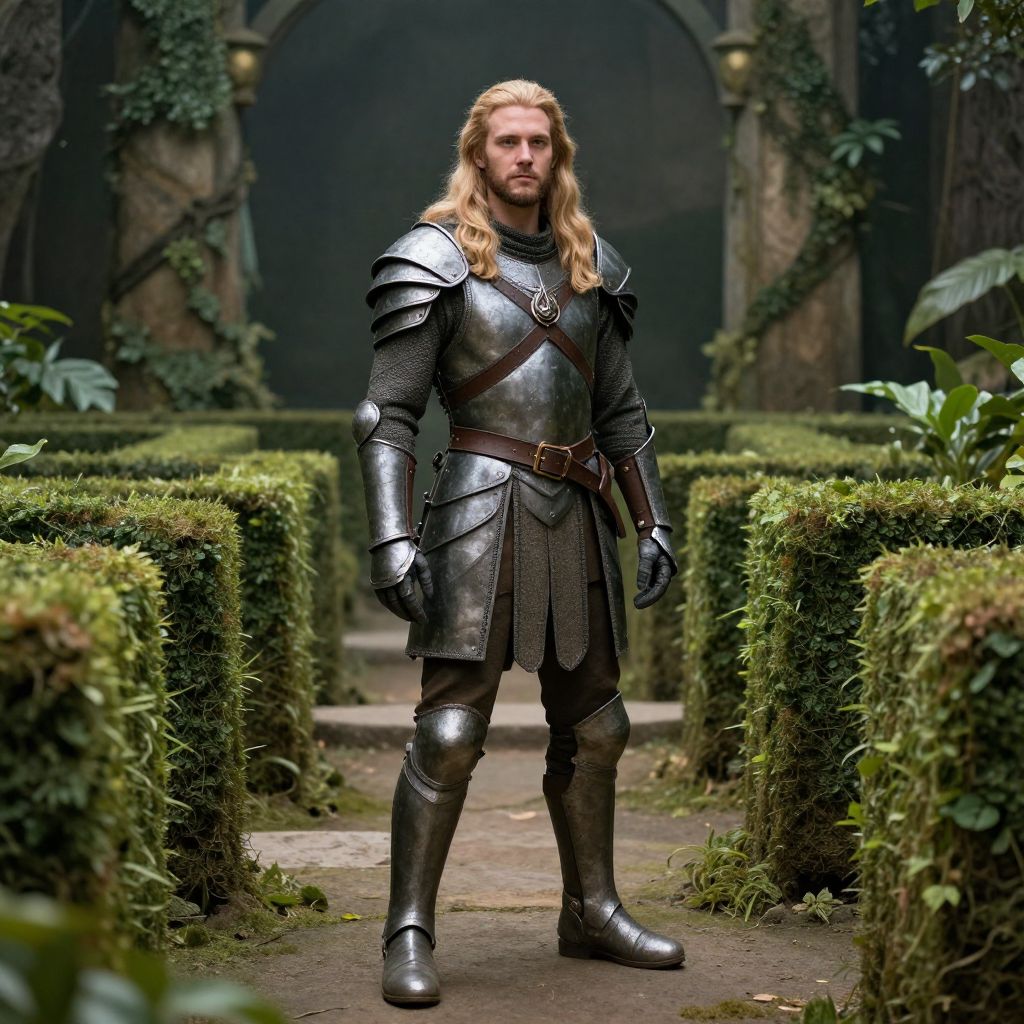 Photograph of a tall, blonde-haired man with a serious expression, standing in a lush, medieval garden. He wears shiny, silver medieval armor with a brown leather belt and gauntlets, and his long hair is loose. The background features tall, ivy-covered stone columns and dark archways, with neatly trimmed green hedges lining a stone path. The lighting is natural, highlighting the reflective surface of his armor. The scene has a fantasy, slightly cinematic feel, with detailed textures in the armor and hedges.