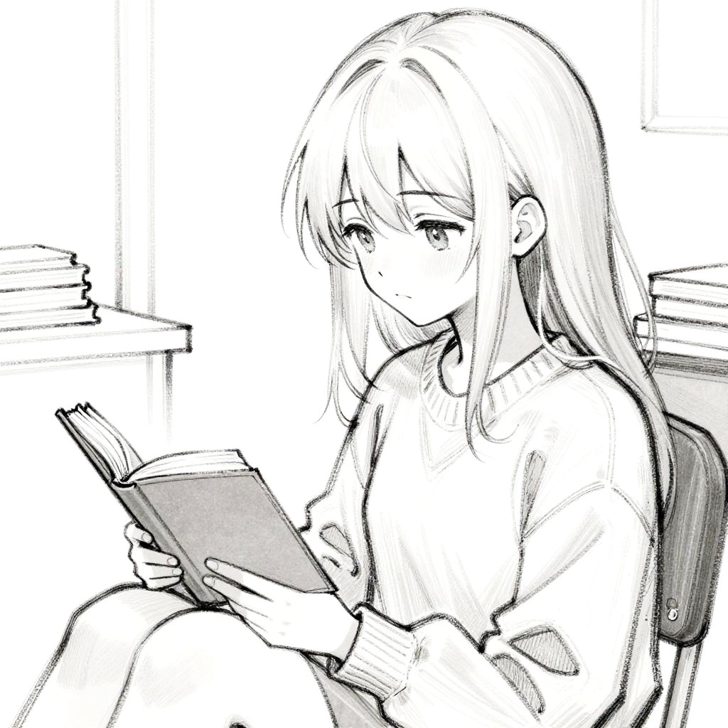 Anime girl sketch sitting reading a book, loose pencil lines, soft shading emphasizing calm atmosphere, detailed hair and clothes texture, expressive eyes looking down, sketchy background with faint hints of furniture, artistic and delicate hand-drawn style