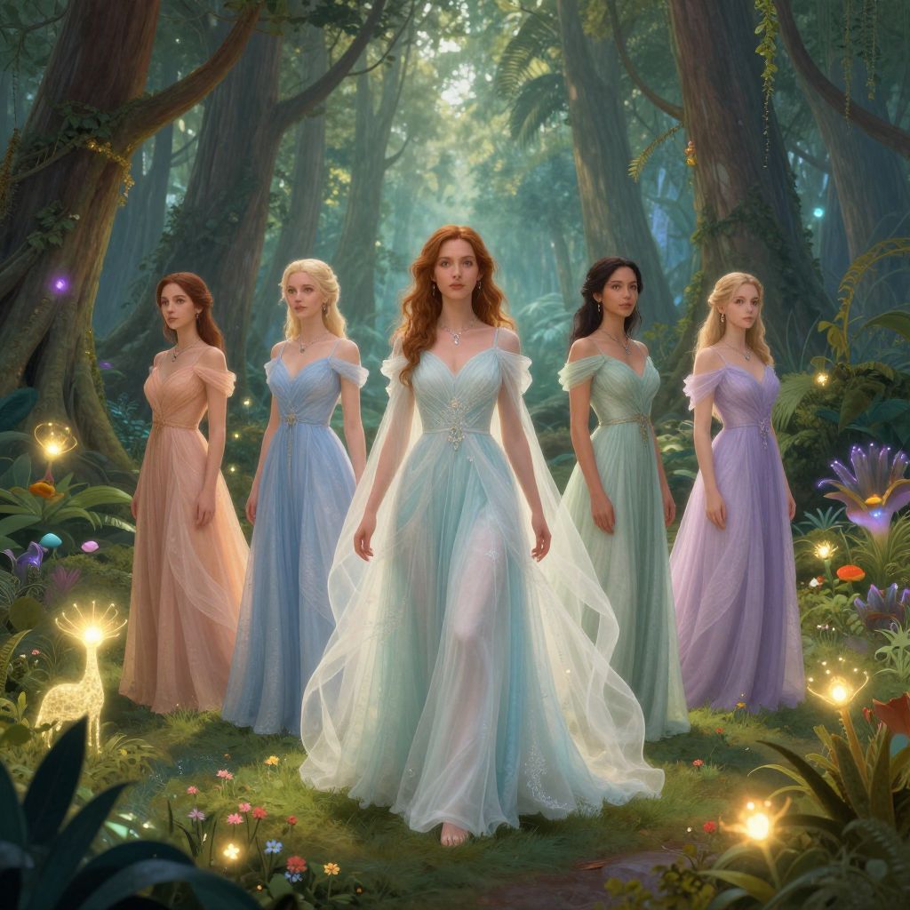 Wimen standing in a vibrant fantasy forest, dressed in flowing ethereal gowns, surrounded by glowing plants and magical creatures, soft natural lighting, mystical atmosphere, detailed character design, fantasy art style