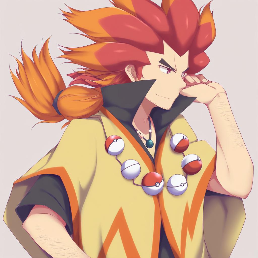 Alder (pokemon), pokemon, 1boy, orange hair, red hair, long hair, two-tone hair, facial hair, arm hair, spiked hair, leg hair, ponytail, hair tie, popped collar, necklace, poncho, poke ball (basic), poke ball, by artist suterii, leet
