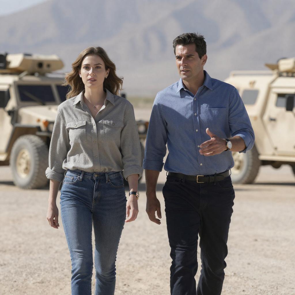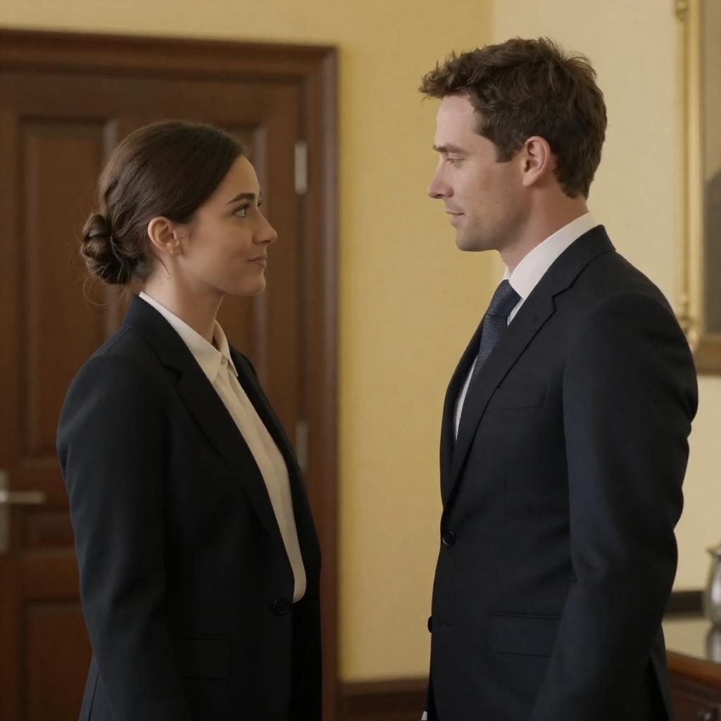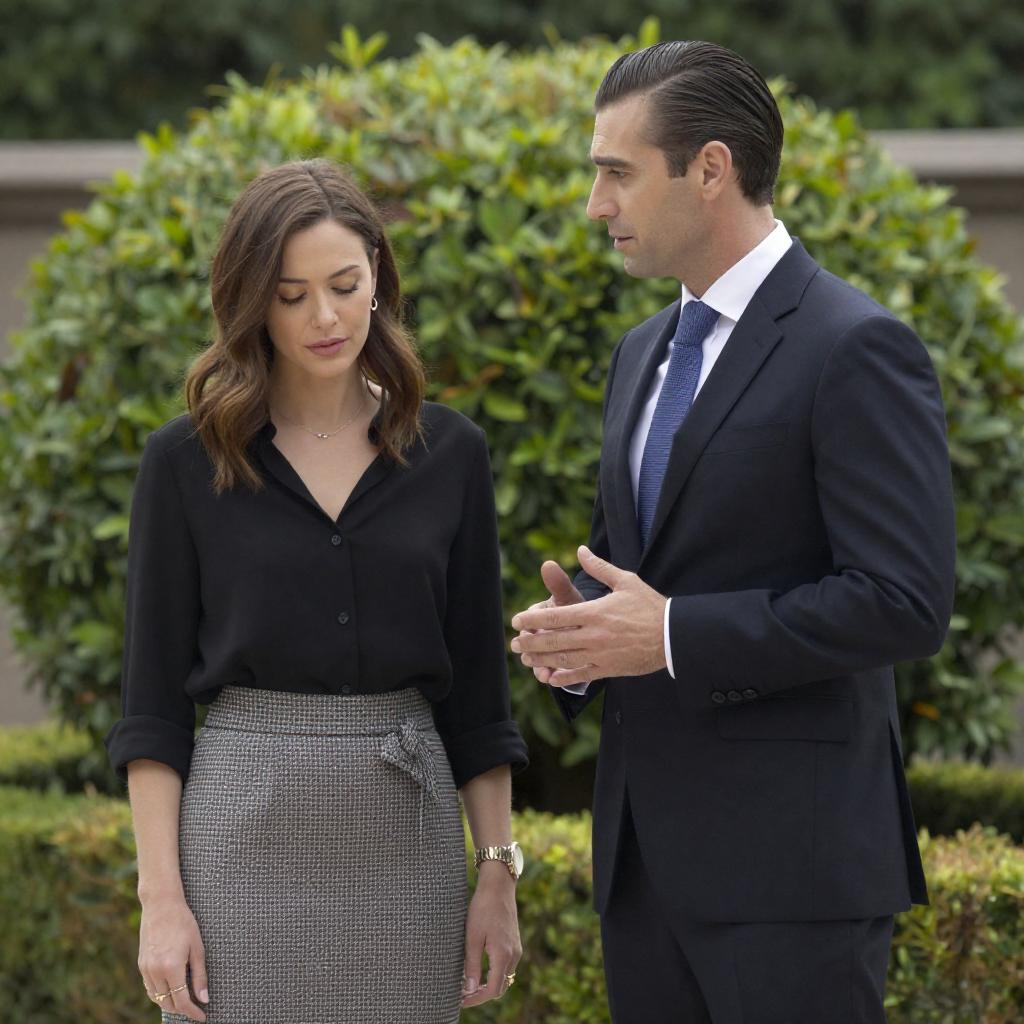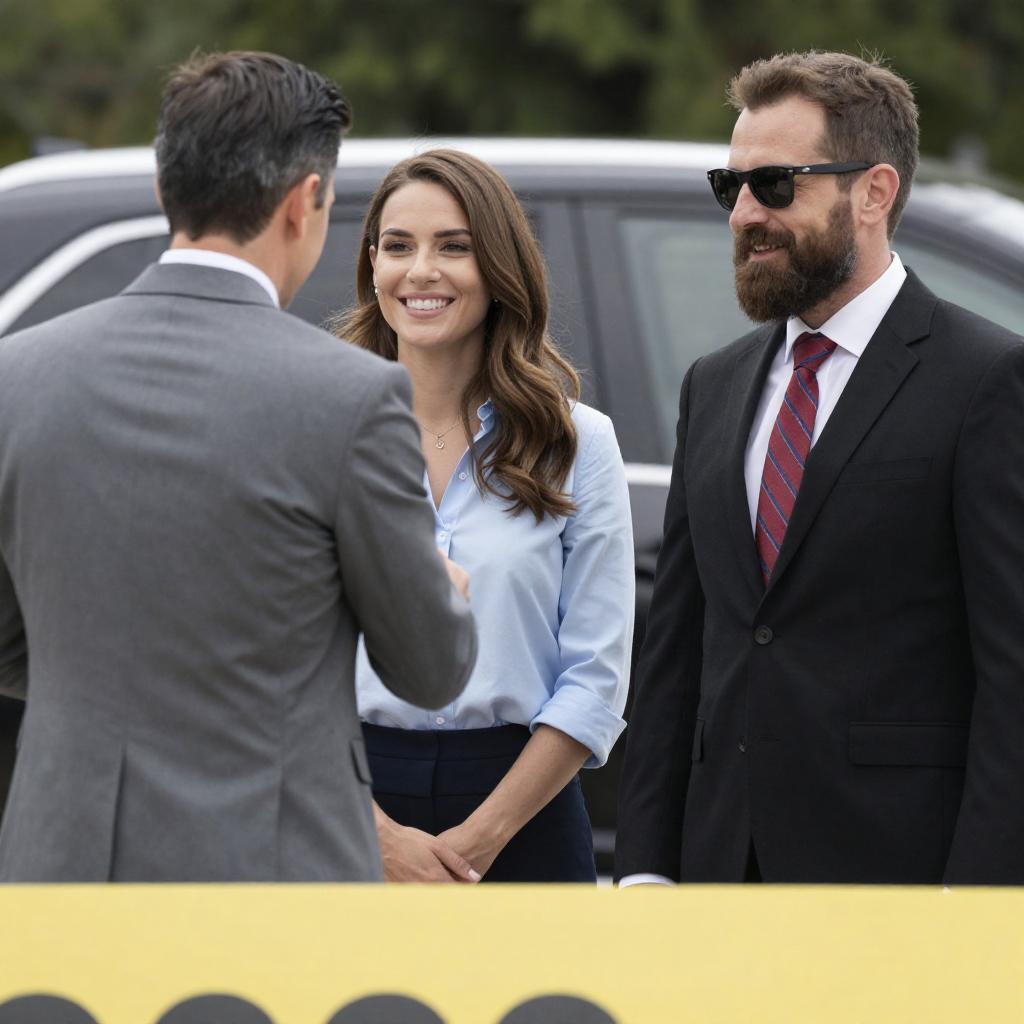 Photograph of a man and woman standing outdoors in a garden. The woman, with shoulder-length brown hair, wears a black blouse and checkered skirt, looking down shyly. The man, with slicked-back dark hair, wears a dark suit and blue tie, gesturing with his hands. Green bushes and trees form the background.