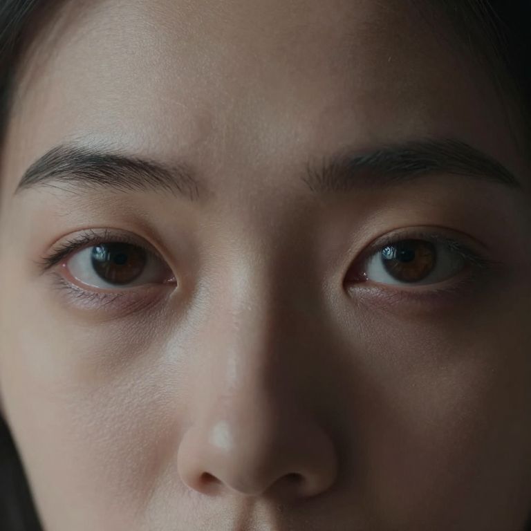 Generate a super-realistic portrait showcasing an innovative close-up perspective of a person's eyes from a worm's-eye view, revealing intricate details and intense emotions as they transition between vulnerability and strength. Capture this in a dimly lit studio with subtle directional lighting that highlights delicate folds around the eyes and casts mesmerizing shadows on the skin, evoking intimacy and depth.