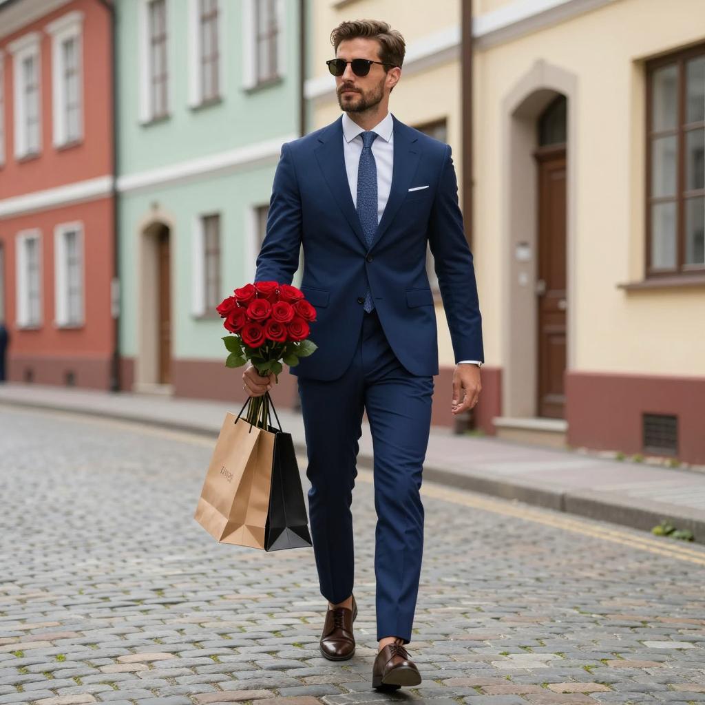 A dapper man in a tailored blue suit walks confidently down a charming cobblestone street, holding a bouquet of red roses and a stylish shopping bag. The vibrant colors of the buildings around him create a picturesque backdrop, enhancing the sophisticated ambiance of this urban setting.