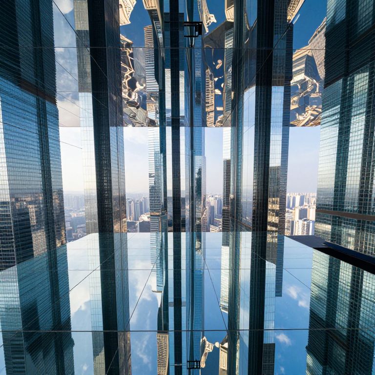 Reflection photograph of skyscrapers in a modern city, showing mirrored glass windows and blue sky with white clouds. Vertical and horizontal lines dominate. Urban architecture