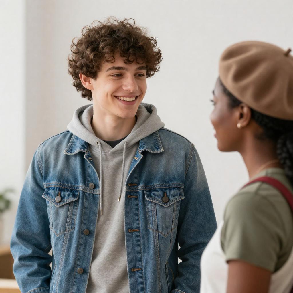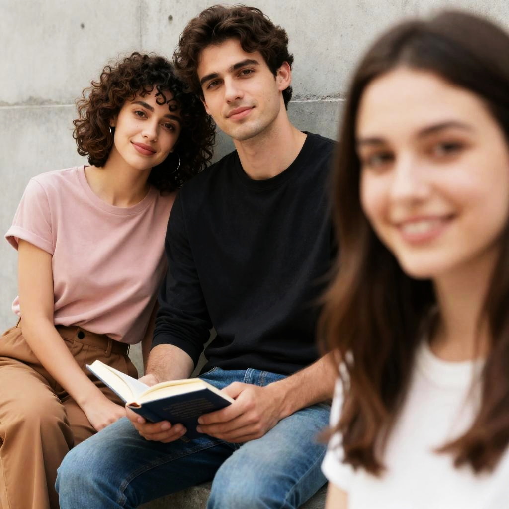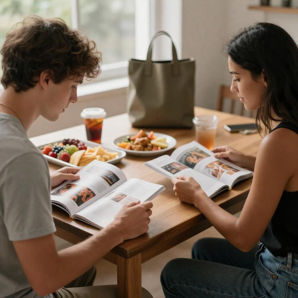 Photograph of two people sitting at a wooden table. Male on left with short brown hair, grey t-shirt, holding open magazine. Female on right with black hair, tan skin, black tank top, holding open magazine. Both focused on magazines. Table has food trays, drinks, and bags. Sunlight through window in background.