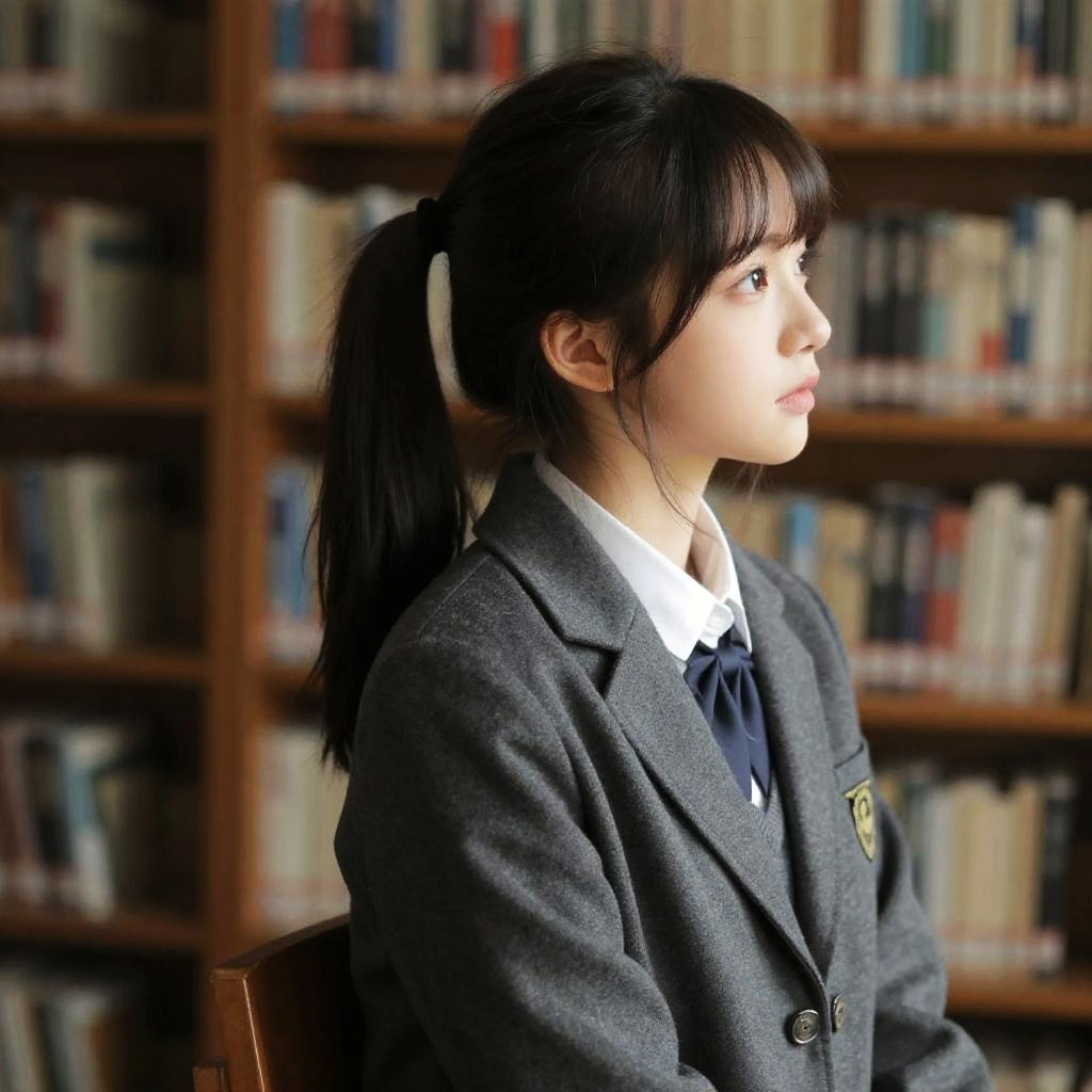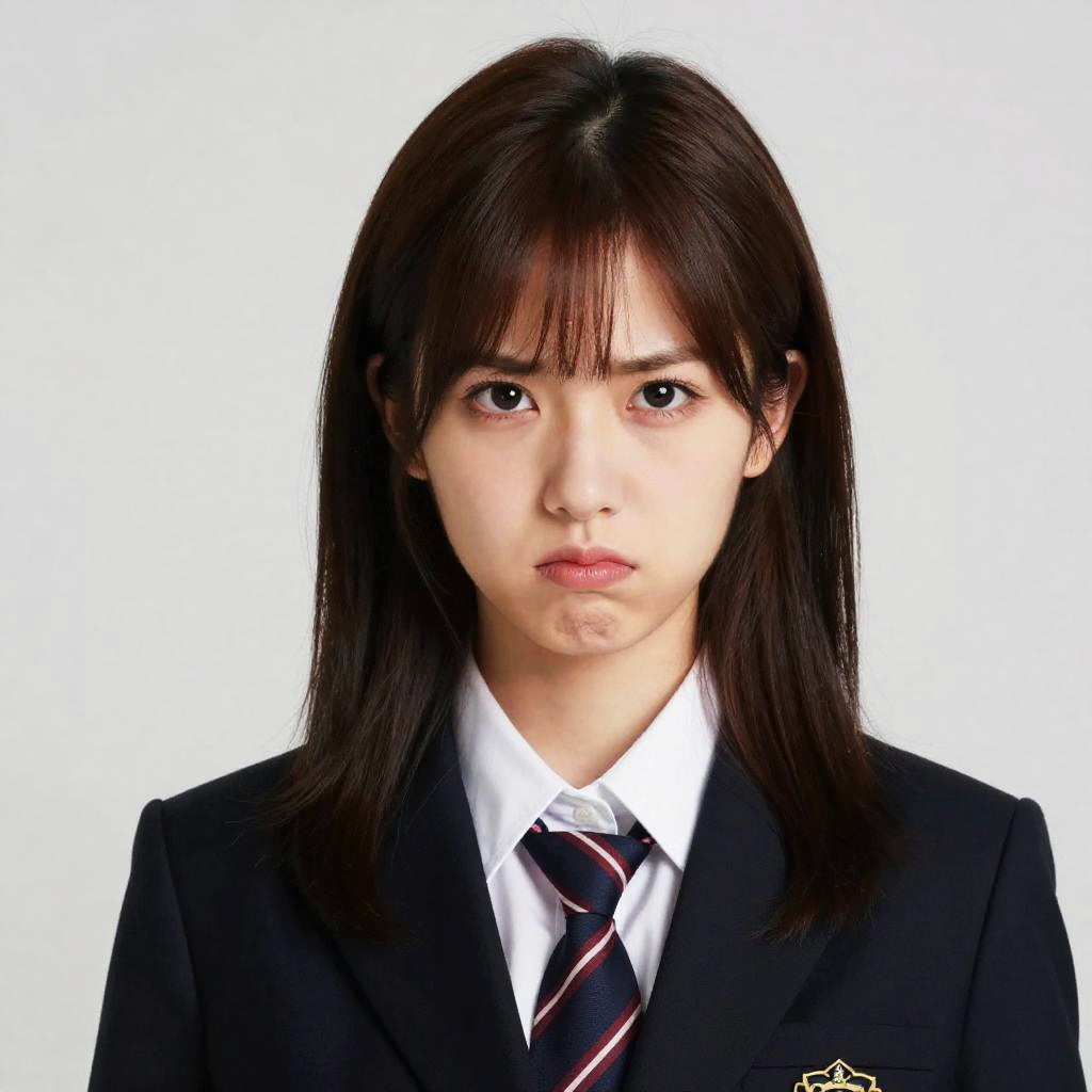 Photograph of an Asian woman with straight black hair, wearing a black school uniform with white shirt and striped tie, against a white background, looking directly