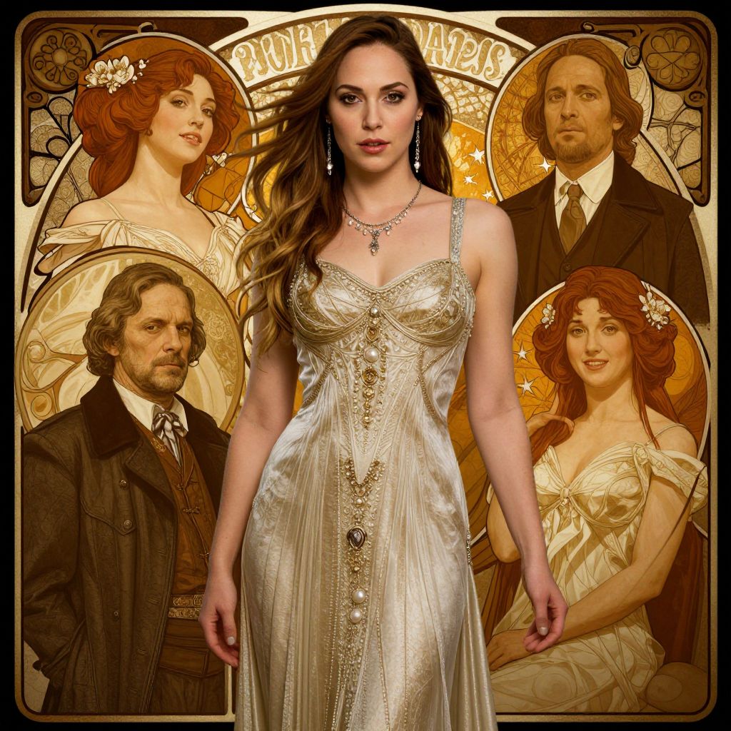 Photograph of a brunette woman in a golden, beaded dress, surrounded by Art Nouveau-style illustrations of a man and three women.