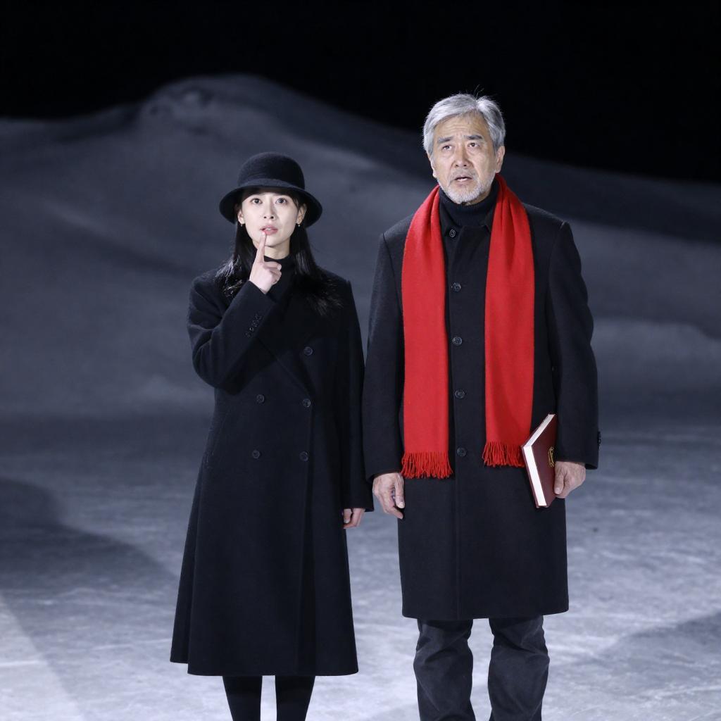 Old man in black cloak and hat with white scarf, standing beside young woman in white vest over maroon shirt. Both leaning on light blue control panel. Background: circular patterned wall. Man's hands on panel, woman looking forward.