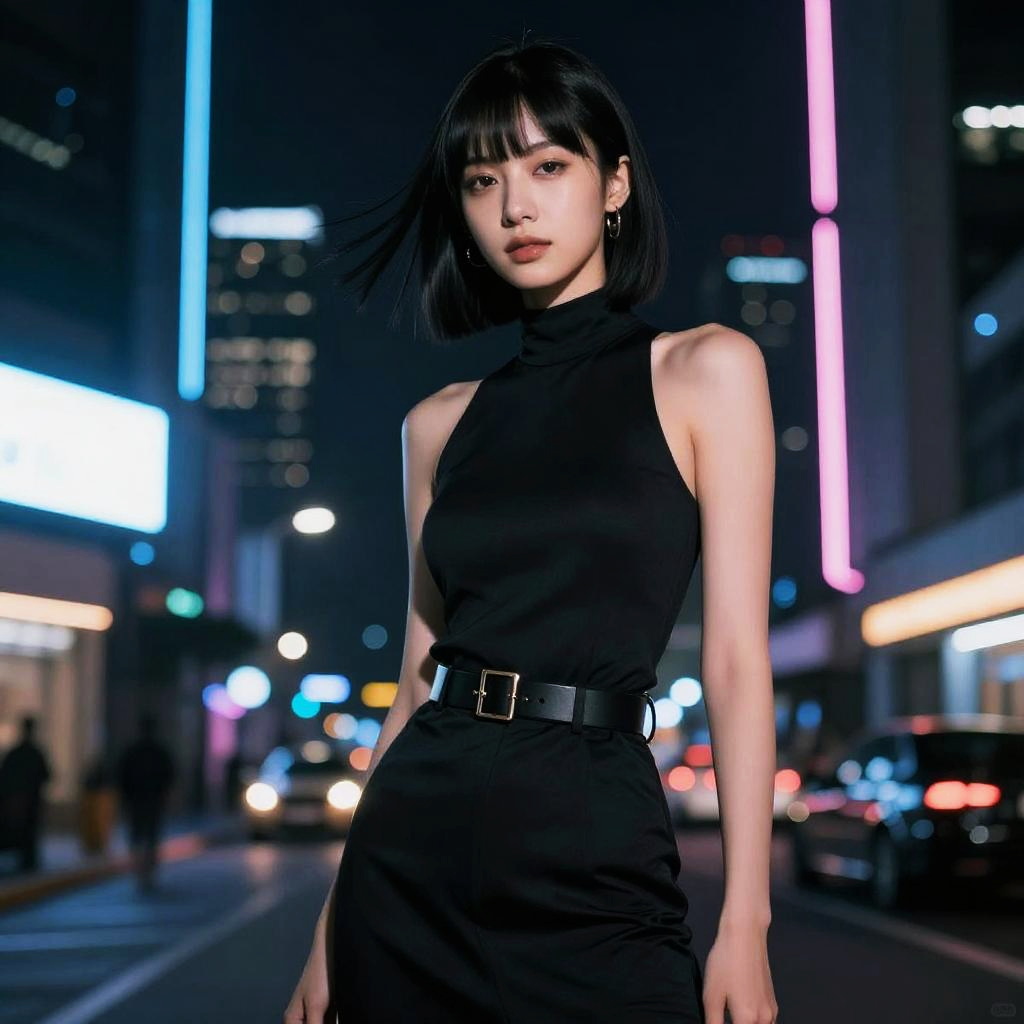 Asian Y2K fashion shoot, edgy model with graphic tees, translucent raincoat, low-rise pants, playful accessories like chokers and mini backpacks, glowing cityscape, vibrant color palette