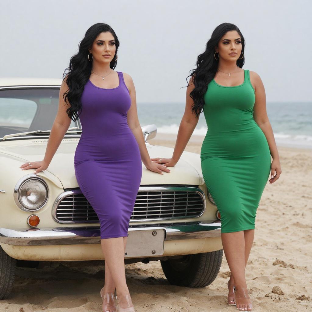 Two curvy women with long black hair stand beside a vintage car. The woman on the left wears a tight purple dress and clear heels, while the woman on the right wears a green dress and clear heels. Both have full figures and are posing with their hands on the car. The background shows a beach and ocean.