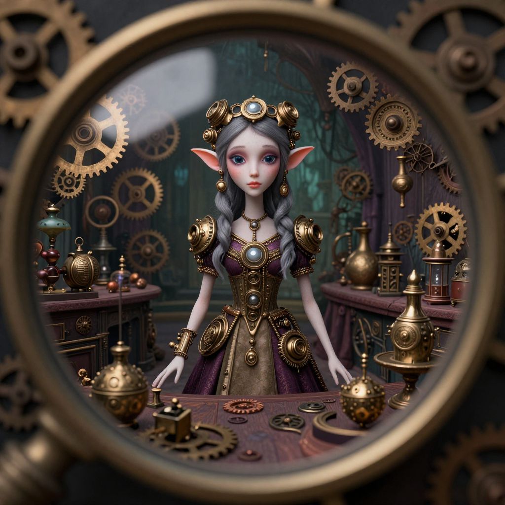 This is a digital CGI fantasy artwork depicting a fair-skinned, elf-like female character with long, silver-blue braided hair and pointed ears. She wears a detailed, Victorian-style gown adorned with gold gears and jewelry, and a matching headpiece. Her large, expressive eyes are purple. The background features a dimly lit, steampunk-inspired room filled with various brass gears, teapots, and cups. A circular, golden frame with gears on its edge encloses the scene, creating a voyeuristic effect. The overall color palette is dark with metallic and purple hues, adding a mystical, clockwork atmosphere.