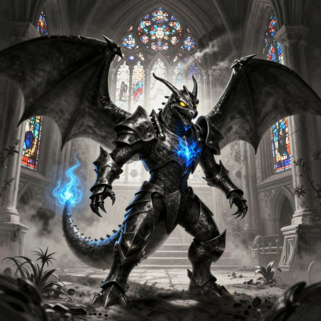 [(by Scavy, by Nicola Samori, by Zack Snyder, by Ferdinand Knab):(graphite \(artwork\), ink):0.75], solo (mega charizard x:1.3), (black body, yellow eyes, blue fire, spread wings, elden ring), (black armor, standing, three-quarter portrait, three-quarter view, looking at viewer:1.25), , (middle ages church, plant, glowing, neon light, storm cloud, stained glass, foggy), (detailed background, depth of field, shadow, backlighting), masterpiece, best quality, ultra realistic, 4k, 2k, (intricate:0.9), (high detail:1.25)