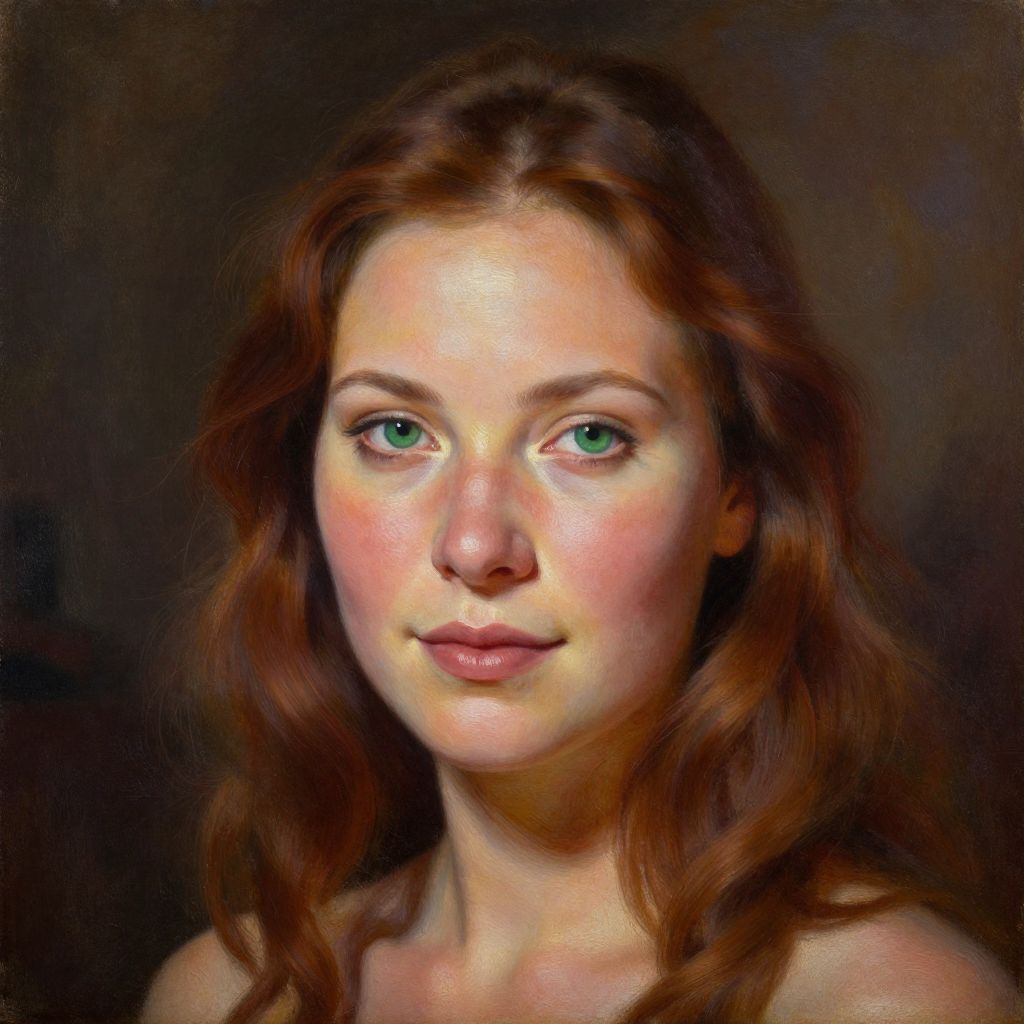 Digital painting of a young woman with fair skin, green eyes, and wavy auburn hair, against a dark, blurry background.
