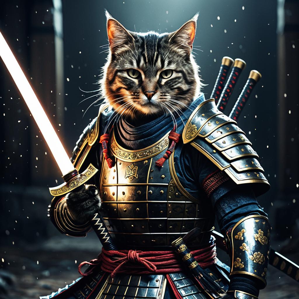 Samurai cat with glowing armor, high resolution concept art, epic, detailed