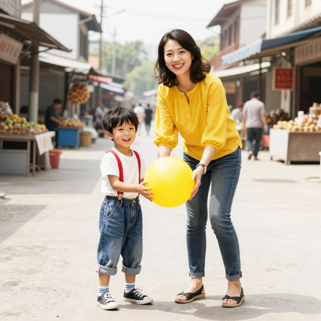 A vibrant photograph of an Asian woman with shoulder-length black hair, wearing a yellow blouse and blue jeans, smiling warmly at a young boy with short black hair. The boy, dressed in a white shirt with red suspenders and blue jeans, holds a bright yellow balloon. They stand in a bustling outdoor market with wooden stalls, baskets of fruits, and other shoppers in the background. The image is slightly over-exposed, with a white border, emphasizing the subjects against the colorful market scene. The woman's cheerful expression and the boy's joyful smile convey a sense of happiness and connection.