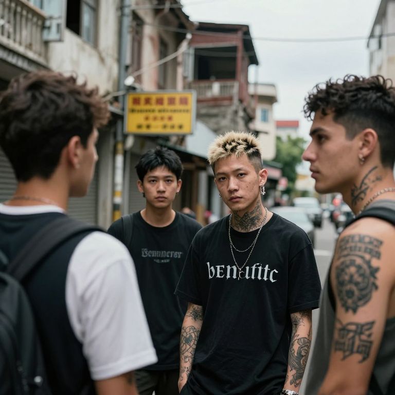 A gritty, urban street scene features a group of characters with distinctive hairstyles and tattoos, set against a backdrop of dilapidated buildings and a yellow sign.