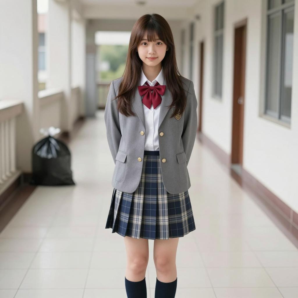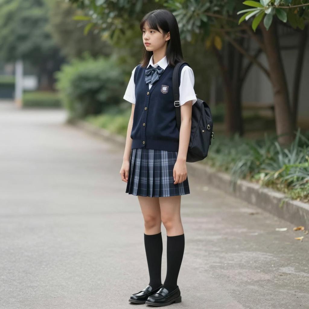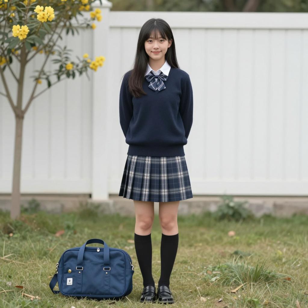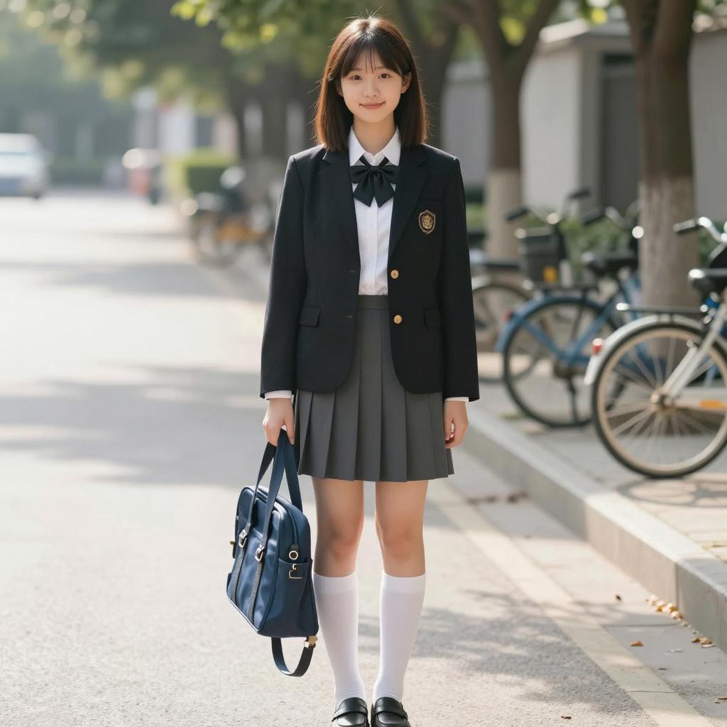 Asian schoolgirl with straight brown hair, wearing black blazer, white shirt, black bowtie, gray pleated skirt, white knee-high socks, and black shoes. She holds a blue backpack in her right hand, standing on a sunlit sidewalk. School crest on blazer. Blurred background with parked bikes and trees. She smiles slightly.