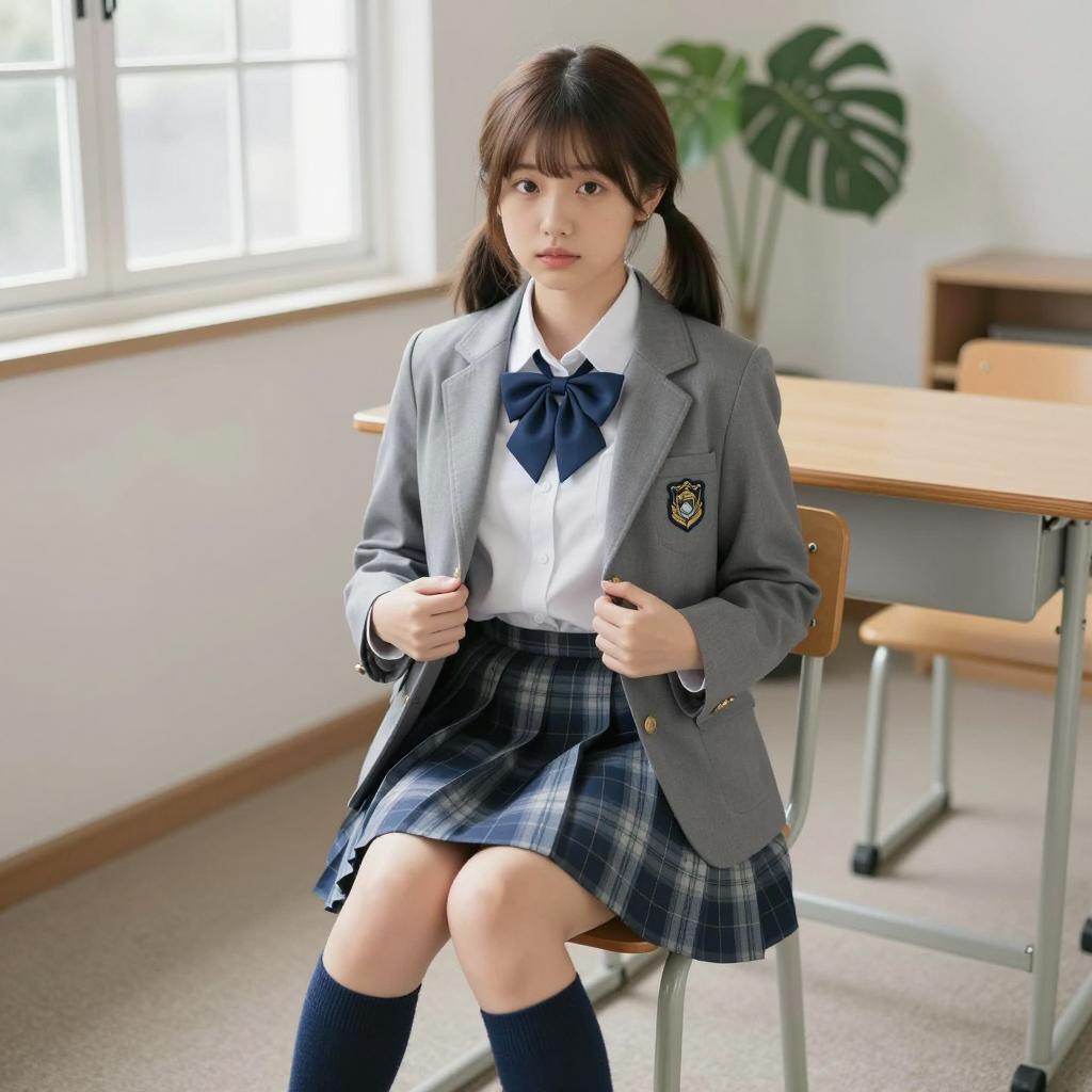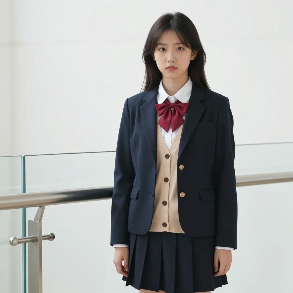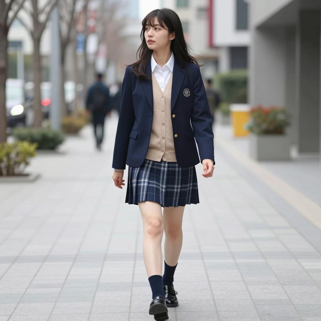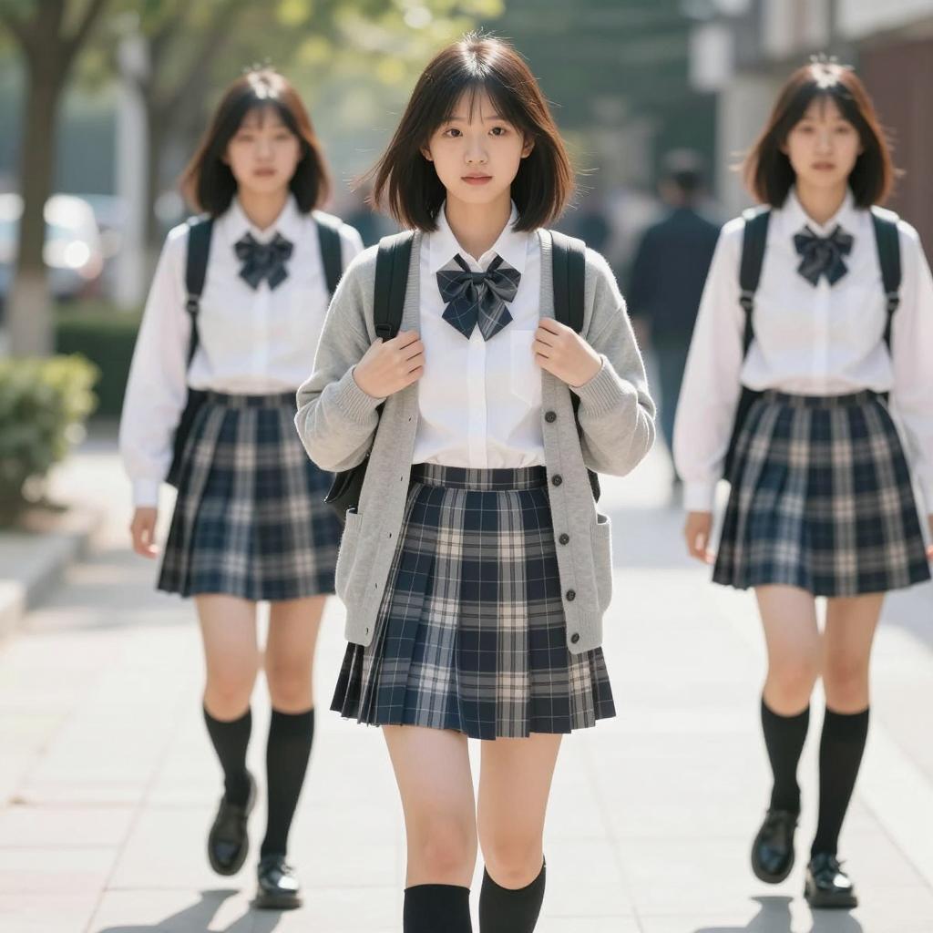 Asian schoolgirl with straight brown hair, wearing black blazer, white shirt, black bowtie, gray pleated skirt, white knee-high socks, and black shoes. She holds a blue backpack in her right hand, standing on a sunlit sidewalk. School crest on blazer. Blurred background with parked bikes and trees. She smiles slightly.