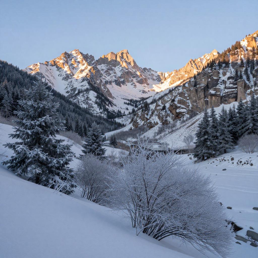 Scenic winter landscape featuring a snow-covered valley with frosted bushes and pine trees in the foreground, leading up to towering, sunlit rugged mountain peaks under a clear sky. The soft golden sunlight highlights the mountain ridges, creating a serene and cold atmosphere.