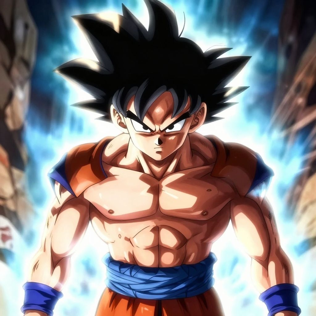 Goku looking down with intense focus, glowing aura surrounding him, dramatic lighting, anime style, detailed muscles and spiky hair, dynamic background of a battle scene