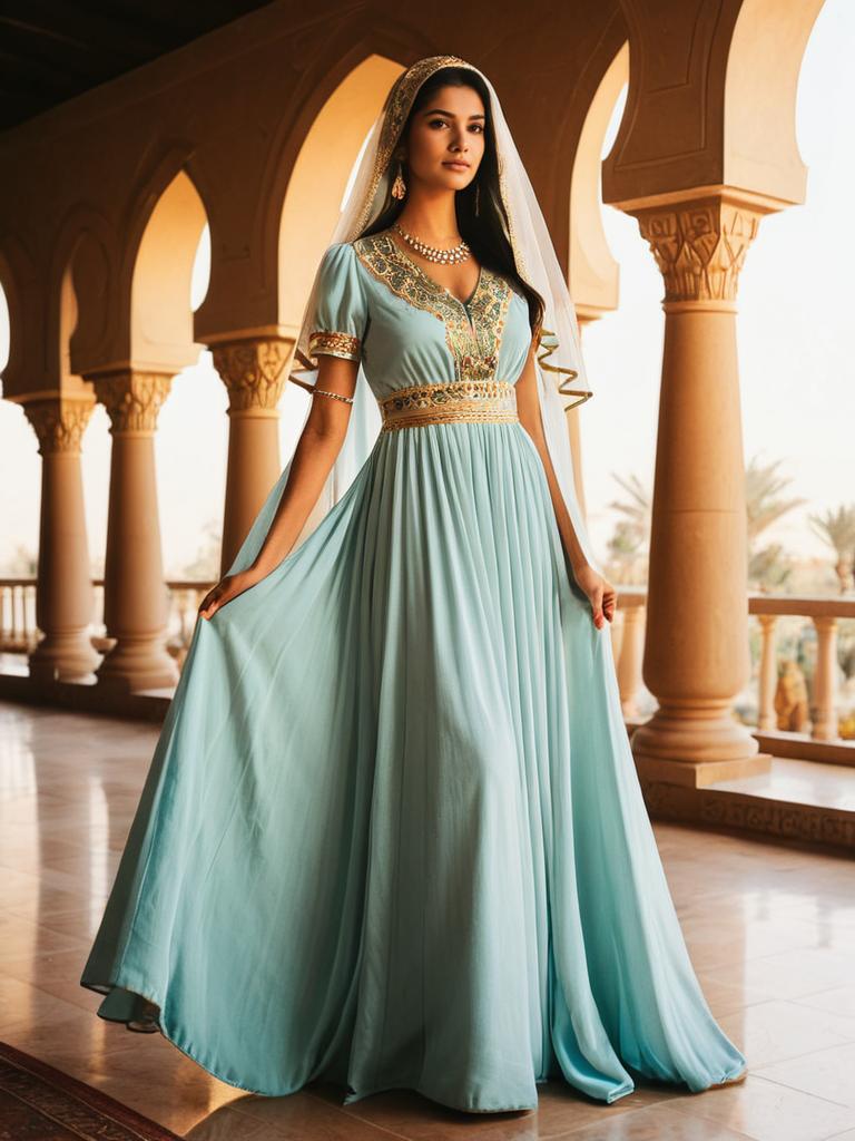 Woman in Arabian Dress, full-body elegant gown photo with veil --sref 1390