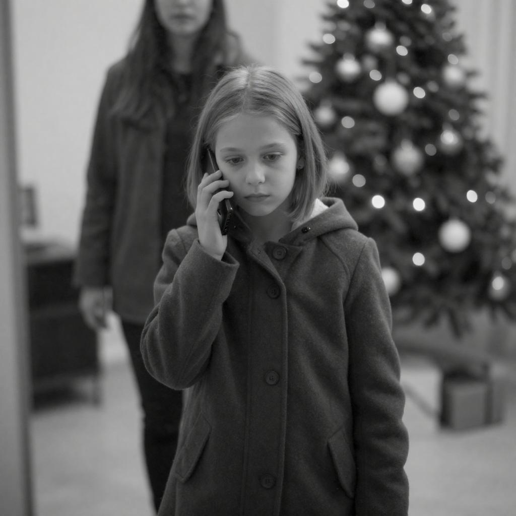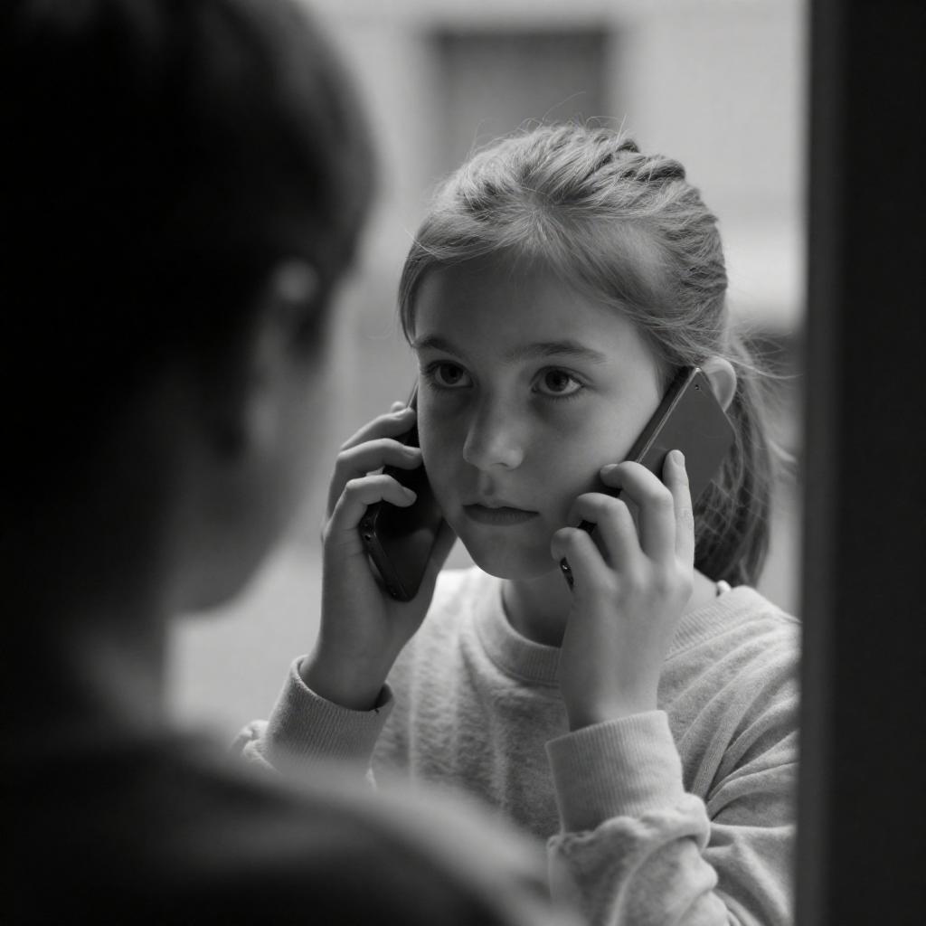 Black-and-white photograph of a young girl with light hair, tied back, intently looking through a window while holding a phone to her ear. Her serious expression contrasts with the blurred silhouette of a person in the foreground. She wears a light-colored sweater. The background is softly lit, highlighting her focused gaze.