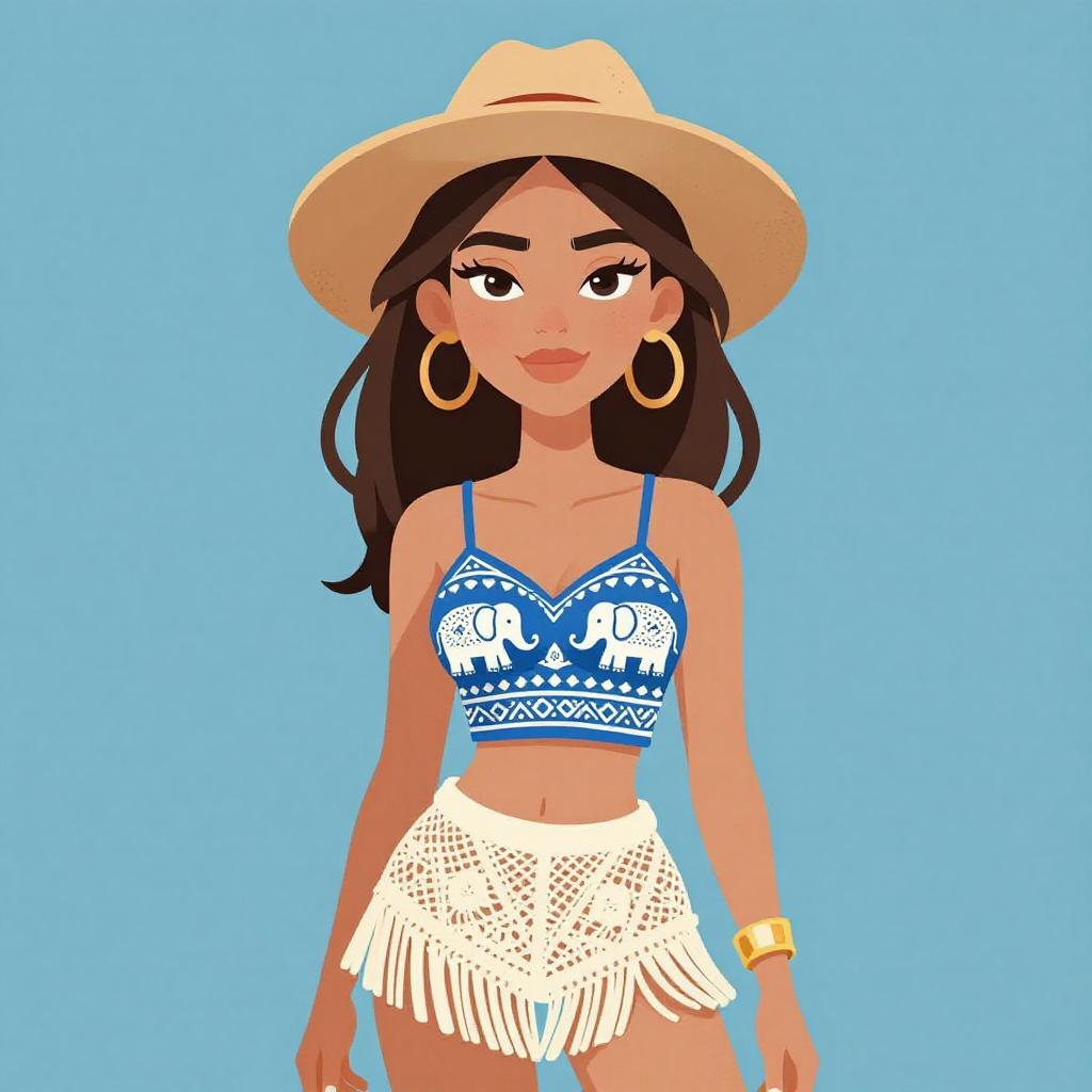 Digital illustration of a smiling woman with medium brown skin, wearing a brown hat, white mandala tank top, and blue jeans, against a light blue