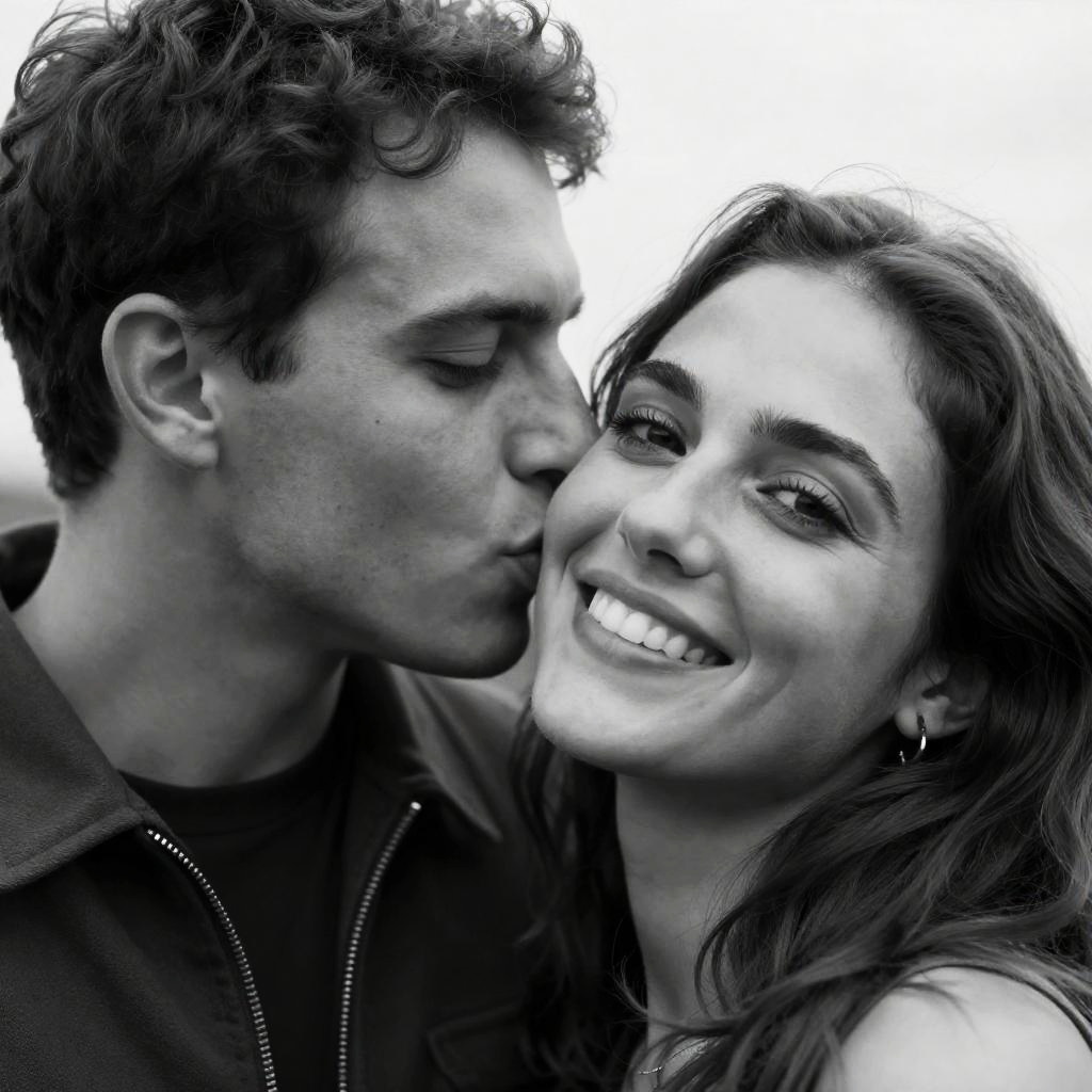 Black and white photograph of a man and woman. Man with short, curly hair, wearing a zip-up jacket, leans close to woman's face, eyes half-closed. Woman with wavy hair, smiles broadly, head tilted back. Intimate, close-up shot.