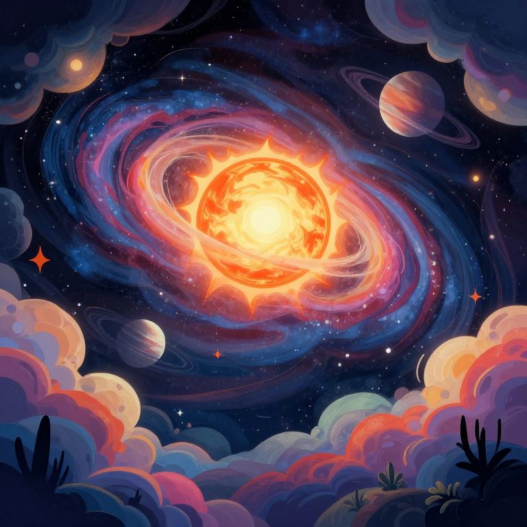 A trippy illustration of the cosmos, featuring swirling galaxies, a glowing sun, and a planet in the background, surrounded by vibrant, abstract clouds and trees.