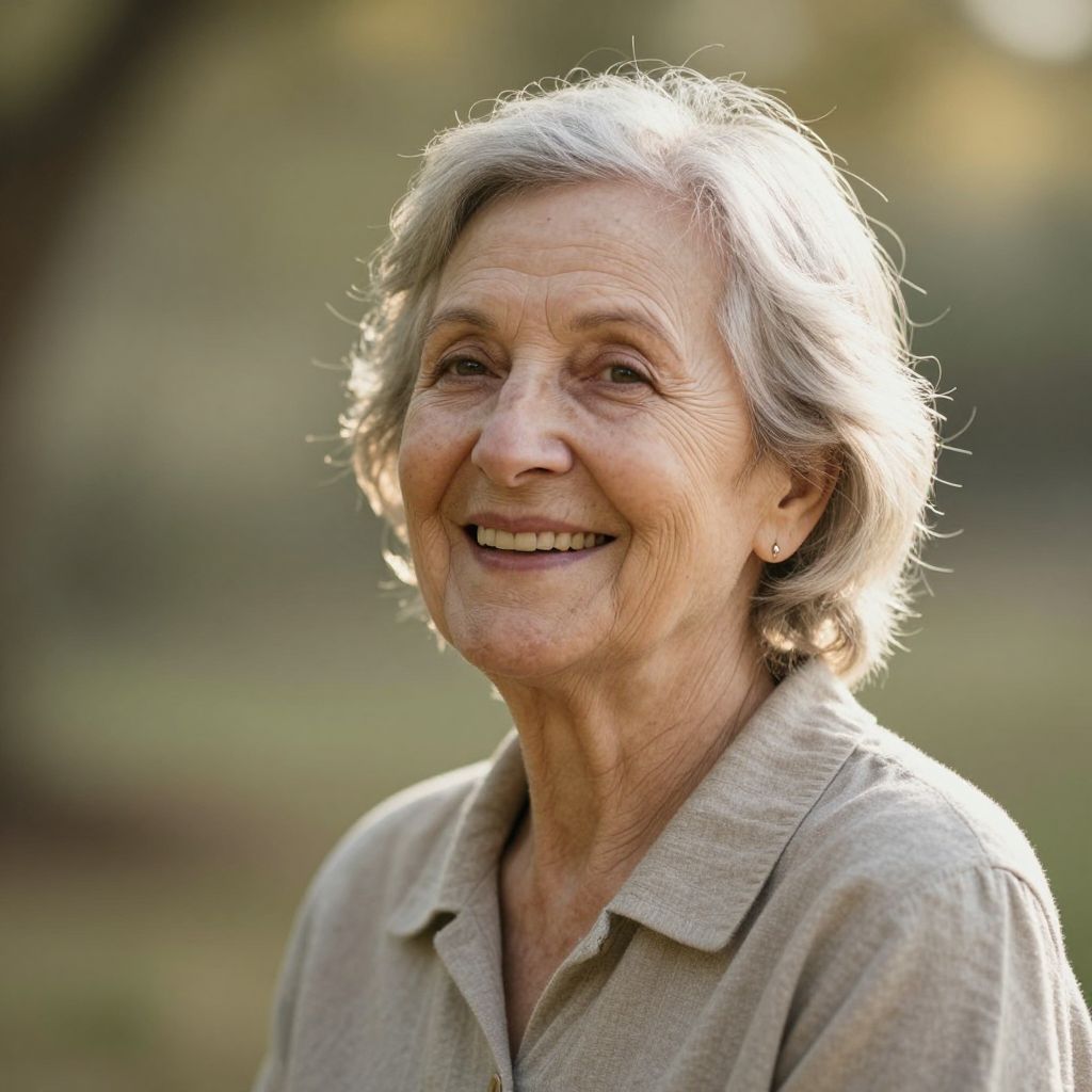 Radiant serenity and timeless wisdom shine through the gentle smile of a senior woman, her laughter echoing warmth and the enduring spirit of life's journey.