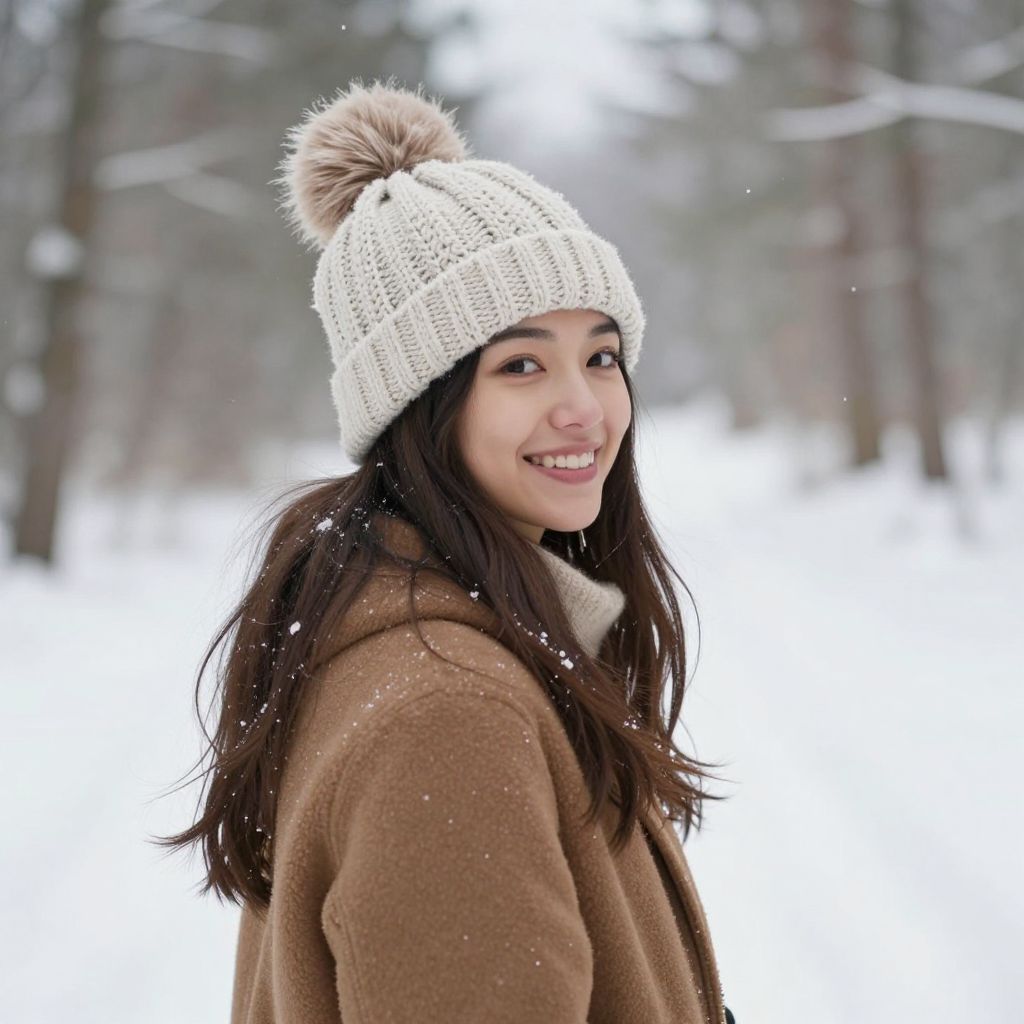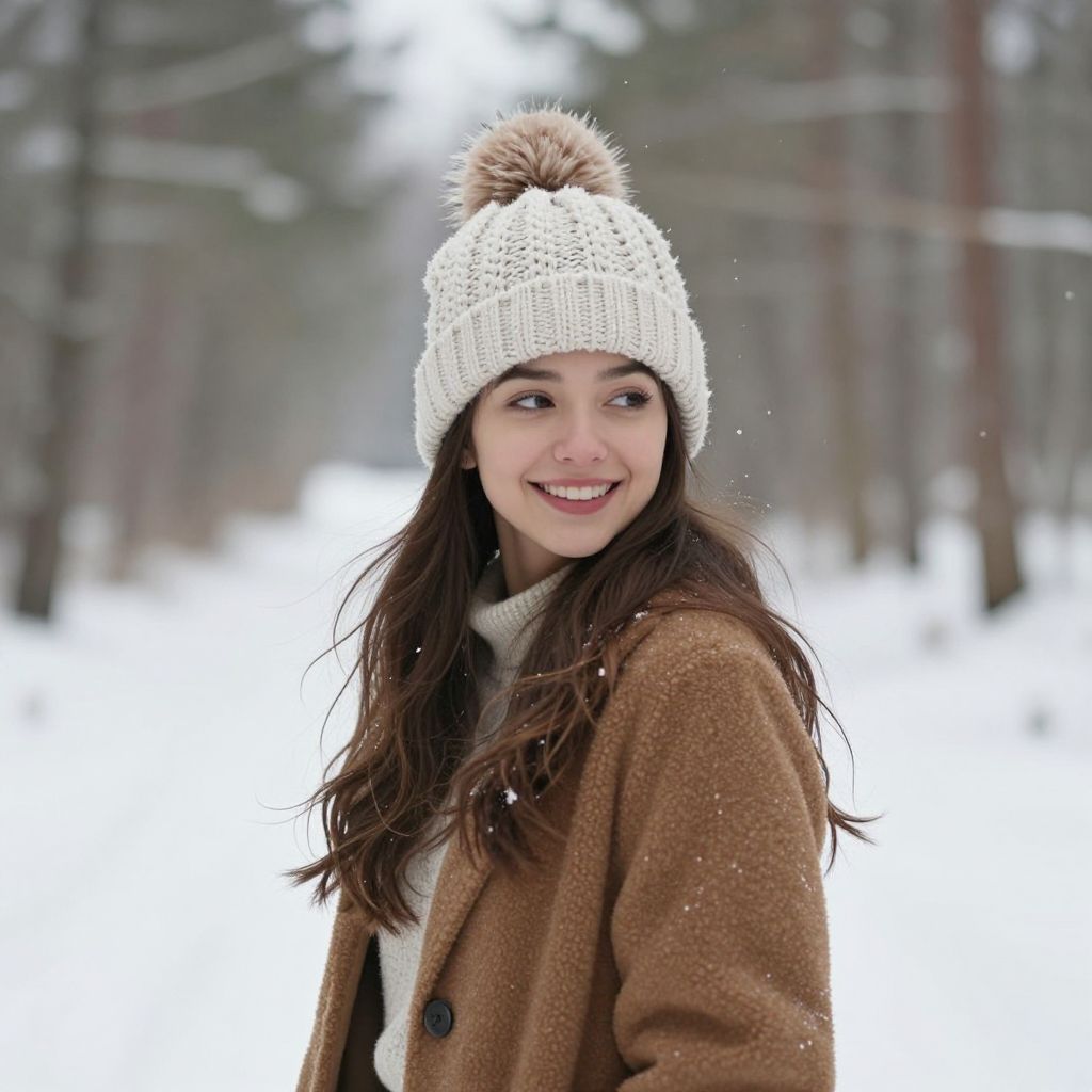 Smiling young woman wearing a cozy knit hat with a fluffy pom-pom and a warm brown jacket, standing amidst a snowy forest path, her long hair flowing gently as she looks away from the camera, exuding warmth and happiness in a serene winter landscape.