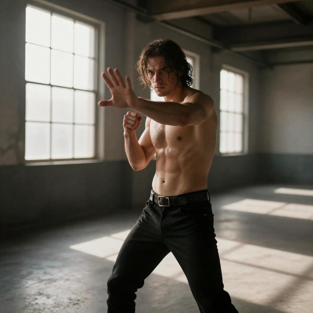 Photograph of a muscular, shirtless man with wet, shoulder-length brown hair, wearing black pants and a leather belt. He extends his right arm forward, fingers splayed, while his left fist is clenched. Sunlight streams through large windows in a dimly lit, industrial-style room with concrete floors and metal beams. His intense expression and dynamic pose suggest readiness for combat.